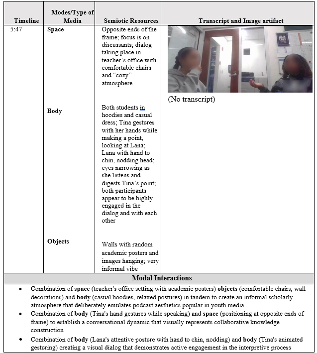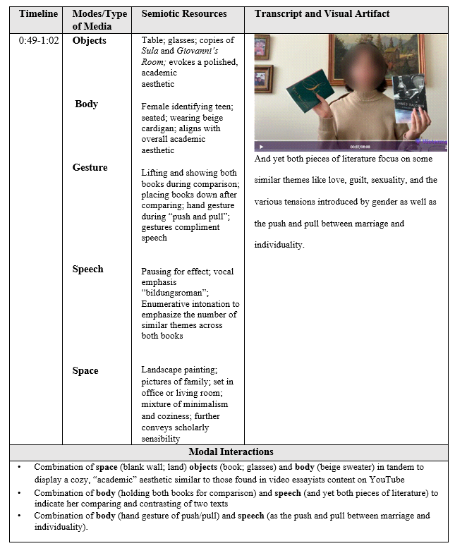 Following Jewitt and Oyama’s (2001) social semiotic approach to visual analysis, particular attention was paid to how participants orchestrated different modes to create meaning beyond what individual modes could achieve in isolation. The instrument’s flexibility accommodated the diverse stylistic approaches observed in participants’ compositions — ranging from traditional video essays to podcast-style dialogs — while facilitating cross-case analysis of ways different semiotic resources were deployed to support literary interpretation.