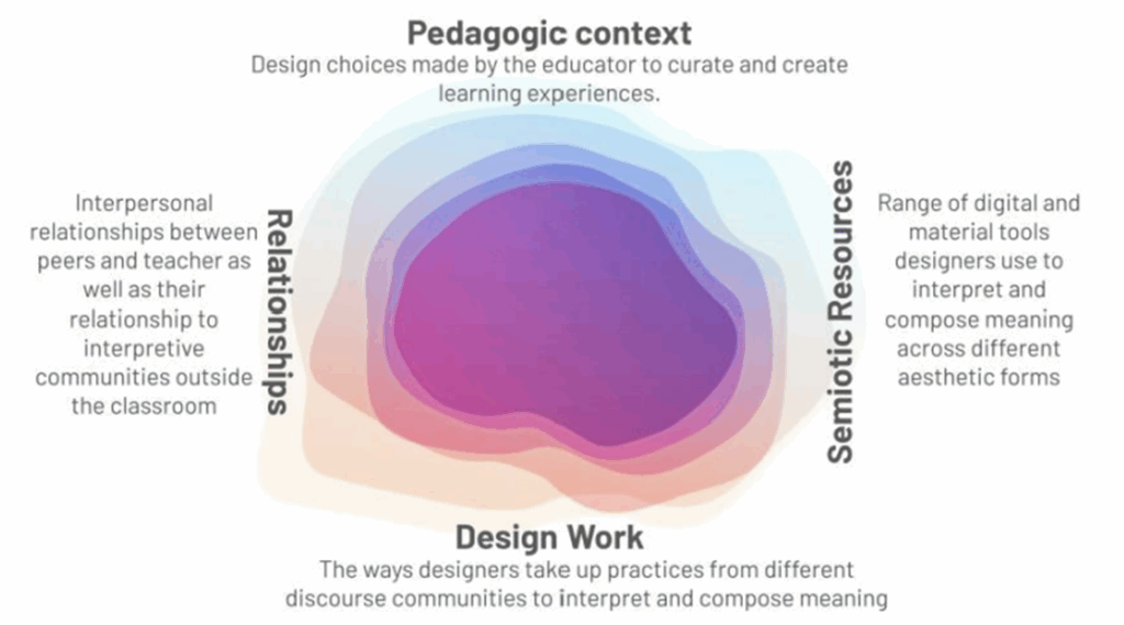 By supplementing aesthetic literacies with social semiotics, this research establishes a framework for examining the ways students navigate their design choices through dual influences: the inherent affordances and limitations of various semiotic modes, alongside the established conventions and socially constructed practices of their interpretive communities. This integrated approach illuminates the dynamic interplay between students’ individual meaning-making decisions and the collective interpretive frameworks that shape and validate those choices within specific social contexts