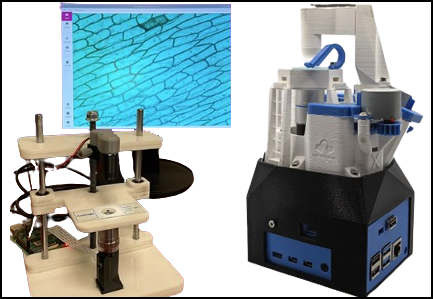 The microscope on the right in Figure 2 is a medical-grade instrument that supports automated microscopy. It is designed for university research laboratories and medical centers. The microscope on the left is a version adapted for high school use. It is based on the same principles as the medical-grade microscope, but its functions have been adapted to facilitate simpler replication in school makerspaces.