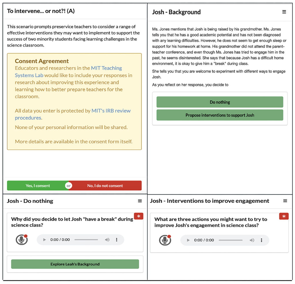 In setting up the simulation for data collection and analysis, the course instructor (first author), created a cohort link for each participating section, and set up the task as a course assignment shared with PSTs on the course’s learning management system. Once PSTs accessed the simulation, the first page they encountered provided a consent agreement to which they must respond (see Figure 2, first image). Details of the simulation then proceed in the way described earlier. Each successive frame has new information or prompts the PST for a response. The PST audio records their response by tapping the microphone icon on the screen (Figure 2).