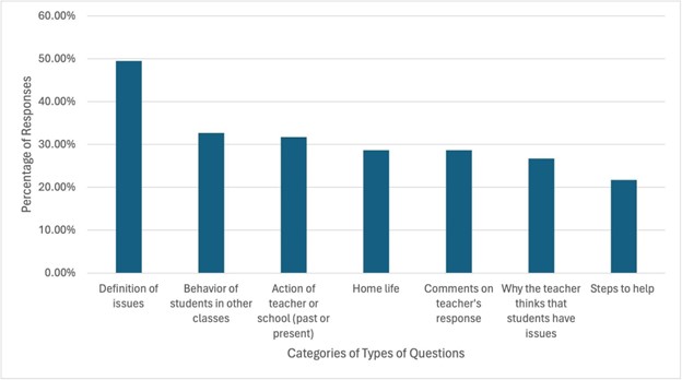 We classified PST’s questions for Ms. Jones into six different types. The first category, “Definition of issues,” refers to queries about what the teacher meant when she stated that the students have “issues.” This category was the largest, with almost half (49.5%) of the responses inquiring how the teacher defined issues and what issues the teacher thought the students had. Almost one third (32.7%) of responses pertained to questions about current or past “Behavior of students in other classes.” About a third (31.7%) of responses were grouped into the “Action of teacher or school (past or present)” category. Questions within this category focused on actions that Ms. Jones or the school might have previously tried with students, including any accommodations.