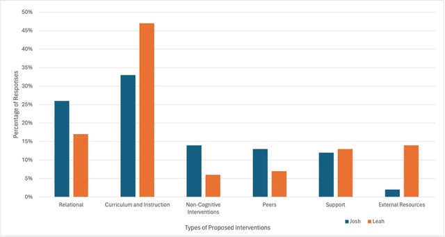 Even though interventions for both children were assigned the same codes, there was a marked difference in the extent to which PSTs referenced interventions along the Relational, Peer, and External Resources, reflecting how they interpreted the children’s backgrounds relative to their prior knowledge and experiences. Some intervention categories were proposed at a higher percentage for Josh than for Leah and vice versa (see Figure 3). Examples of categories that were tapped at a higher frequency for Josh than for Leah were the Peers and Noncognitive interventions categories. The interventions proposed at a higher frequency for Leah than for Josh belonged to the Curriculum and Instruction and External Resources categories.