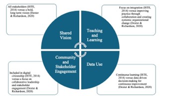 Another similarity between the two frameworks is community and stakeholder engagement. The ISTE standards included this concept as part of digital citizenship, while Dexter and Richardson (2020) focused more broadly on collaborative leadership and stakeholder partnerships. Both frameworks also addressed the importance of data use, with the ISTE standards focused on using technology for continuous learning. Dexter and Richardson (2020) emphasized using data-driven decision-making for instructional improvement.