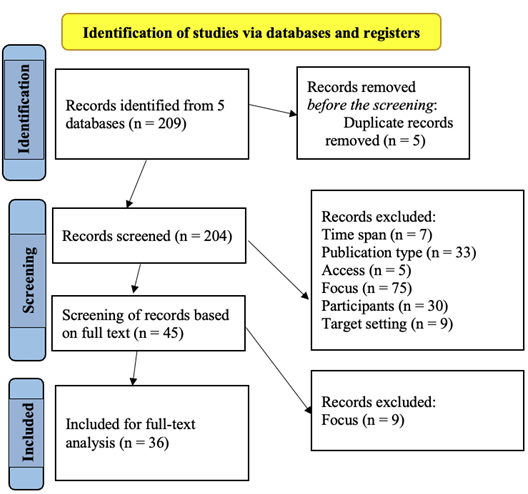 We screened 209 articles using the predetermined inclusion and exclusion criteria (see Table 2). First, we excluded five duplicates. Then, we excluded 159 articles because they did not meet the inclusion criteria: publication type (33), time span (7), participants (30), target setting (9), focus (75), and access (5). We then read the full text of the remaining 45 articles to ensure their contents were relevant to our research questions. We excluded nine more articles because of their focus. As a result, 36 articles met all the inclusion criteria and were included for further assessment (Appendix A). Figure 2 illustrates the flowchart of the data collection processes.
